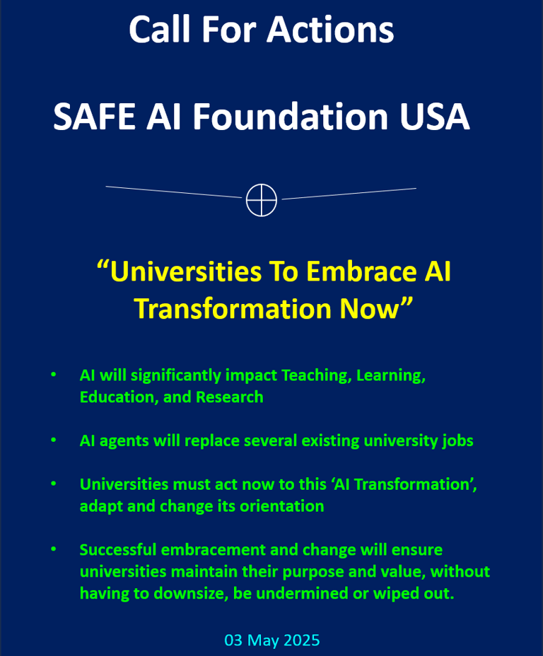 On 03 May 2025, the SAFE AI Foundation launched four "Call for Actions", directing at industries, government, universities and the public. It is time to act!