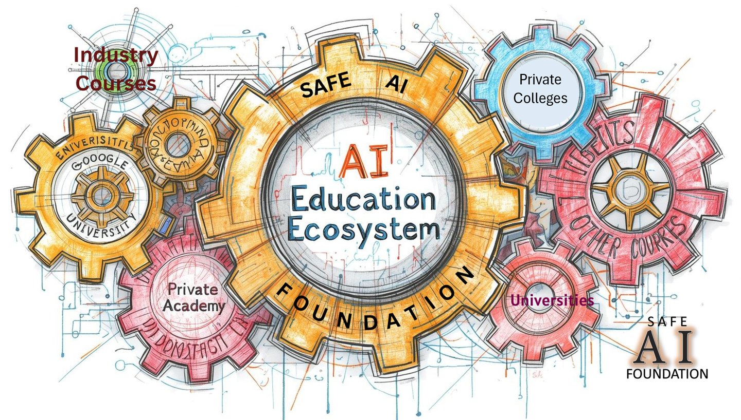 The role of SAFE AI Foundation in AI Education is to function as the Captain of the Ship (AI Education Ecosystem), as shown by the main gear or steering wheel in the Figure aboeve, to help steer AI Education in the RIGHT DIRECTION so that effectively, the mission of making AI Safe & Useful For All can be achieved.