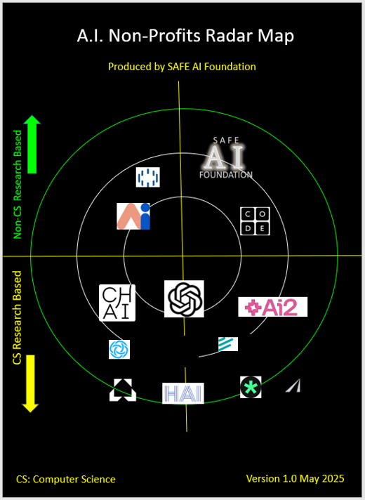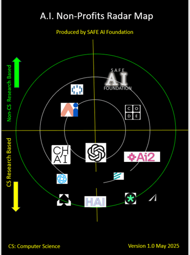 These non-profits, such as SAFE AI Foundation, focus on public facing AI communications, advocacy for Good AI, openness, AI policies, charity work, perform AI risks evaluation, monitor AI trends, alerts on upcoming AI risks, perform AI predictions, educate, and shape AI directions, etc.