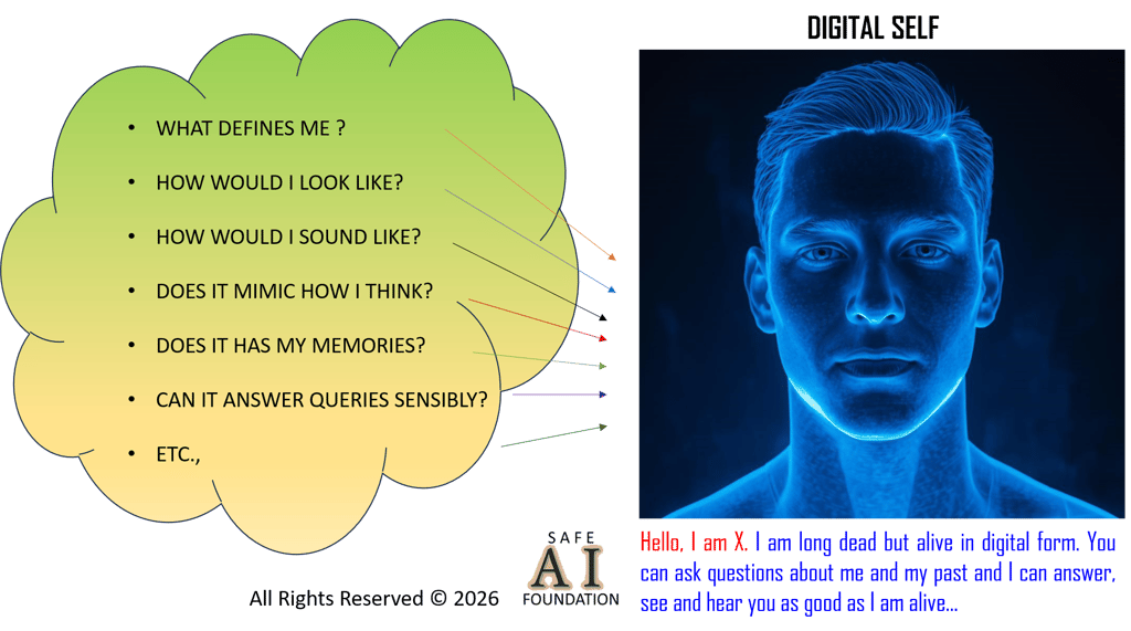 Technical Challenges and Role of AI in Digital Self – Extracting one’s image and voice is easy. Current voice and image capture, encoding and decoding will do the trick. Synthesizing voice using electronic means is achievable. Converting text to voice is doable. Listening is possible through voice (via microphone) or text inputs (keyboards). Hence, with an underlying conservational AI, it would mean that a digital self can be achieved.
